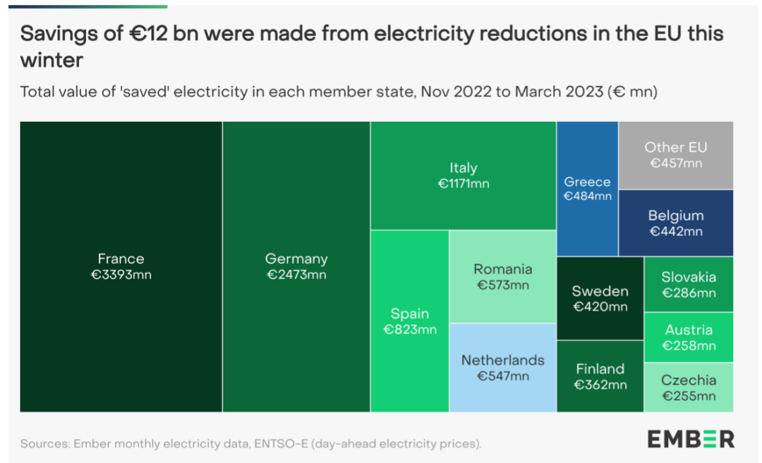 总体而言,与参考期相比,2022年11月至2023年3月欧盟电力需求减少节省了价值120亿欧元的电力。在所有成员国中,法国的储蓄总额最高,为34亿欧元,其次是德国,为25亿欧元。然而,可以预见的是,从绝对值来看,拥有电力市场规模最大的国家节省的资金最多。
