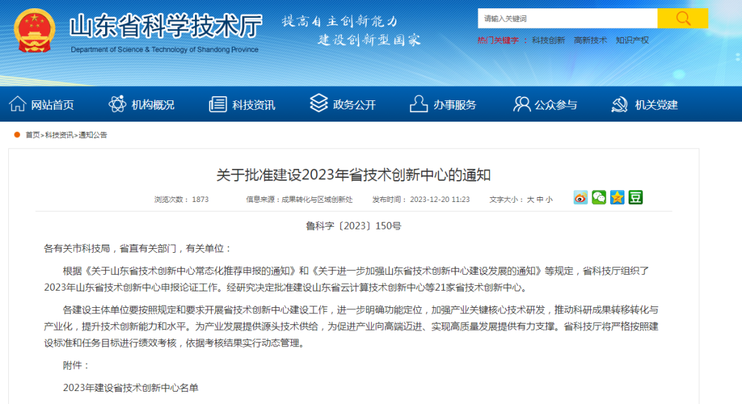 近日,根据《关于山东省技术创新中心常态化推荐申报的通知》和《关于进一步加强山东省技术创新中心建设发展的通知》等规定,山东省科技厅组织了2023年山东省技术创新中心申报论证工作。经研究决定批准建设山东省云计算技术创新中心等