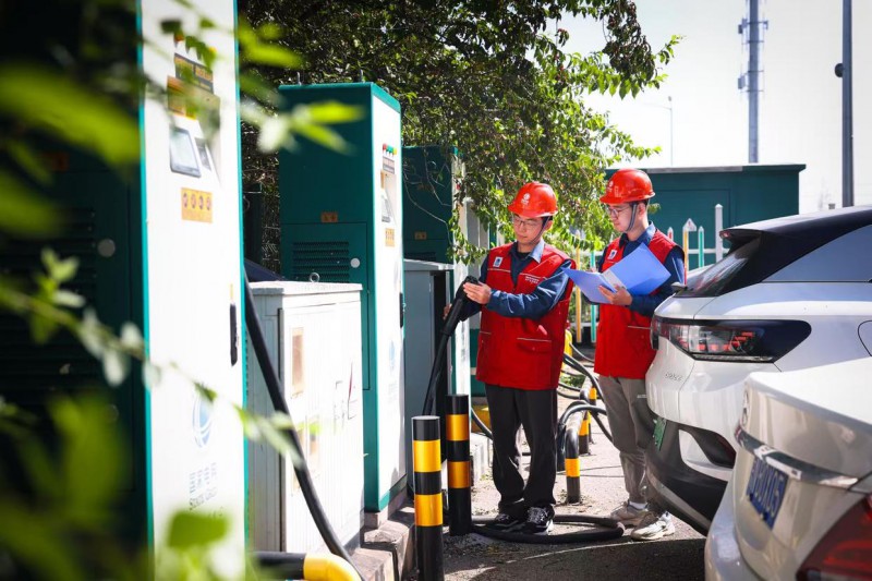 国家电网首都电力(亦庄)共产党员服务队队员在荣昌西街巡检充电站设备。张庆玉摄