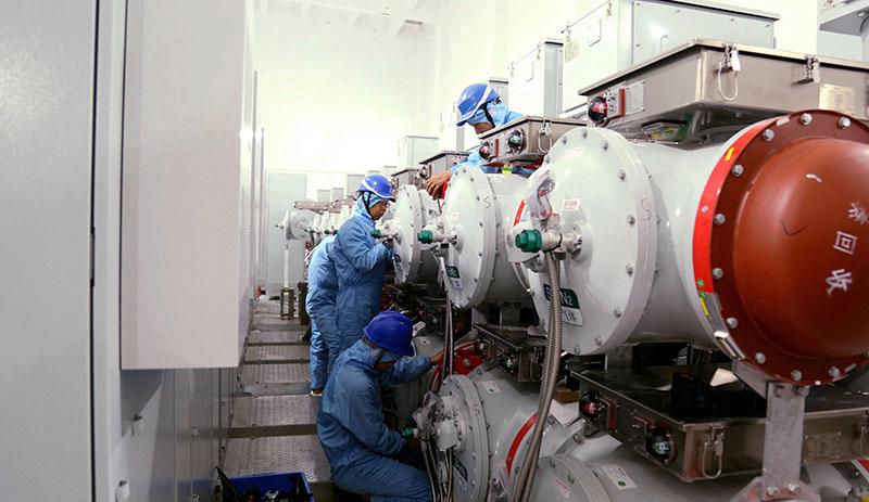 以合州换流站工程为例,10月6日,1200余名特高压建设者、90余台各类机械设备,来回穿梭于合州换流站工程现场,高效开展双极低端换流变、极I低端换流阀、500千伏GIS设备和直流设备安装,同步进行建筑物装饰装修、暖通、消防施工、二次屏柜组立、全站电缆敷设等工作,全面保障工程加速推进。