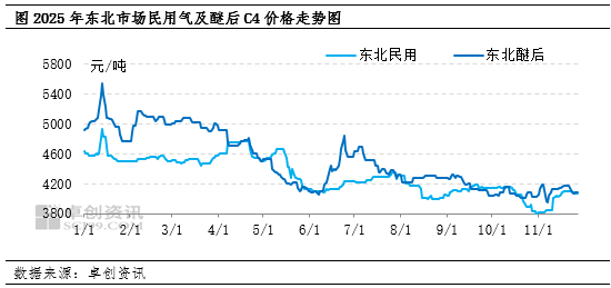 2025年四季度,东北液化气市场整体呈现供需双弱、价格中枢下移的运行特征。10月至11月期间,民用气与醚后碳四走势分化,市场在供应压力与需求疲软的双重制约下艰难寻底。