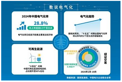 根据中国电力企业联合会数据,2024年,中国电气化率已达28.8%,表明我国全部终端能源消费量中,电能的使用已接近三成。再从横向看,《中国电气化年度发展报告2025》显示,2024年,中国电气化率较上一年提高0.9个百分点,中国电气化率已经高于欧美主要发达经济体。