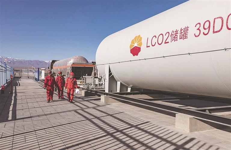 在三塘湖油田牛圈湖东区CCUS-EOR先导试验区,巡检人员在查看设备运行情况。