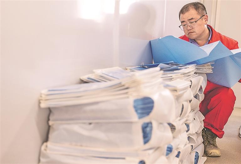 吐哈油田新能源公司(供电公司)技术人员杭鲁军正在查阅风机基础施工图纸。
